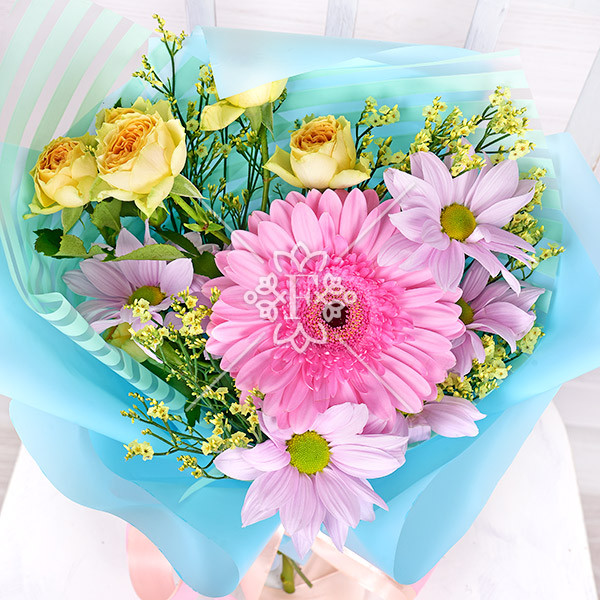Гербера розовая- 1 шт., хризантема кустовая сиреневая -1 шт., роза желтая кустовая - 1 шт., лимониум желтый – 1 шт., упаковка, лента.