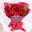 роза красная – 3 шт., роза красная кустовая – 2 шт., альстромерия красная – 1 шт., хризантема красная (бордо) кустовая – 1 шт., зелень декоративная (рускус), упаковка, лента.